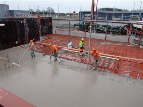 Här gjuts golvet som är delen för omklädning. På bilden syns Philip som slodar, Per kontrollerar höjden och vibrerar samt Patrik som styr betongflödet med hjälp av pumpföraren i bakgrunden.